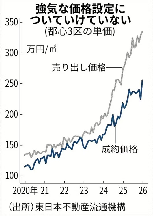 日本経済新聞電子版によれば、東京の都心3区のタワーマンションの売出価格と成約価格の乖離が広がっているそうです(図表も同紙から)。
