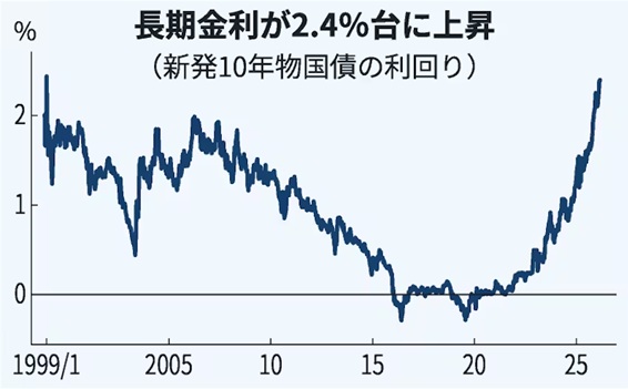 これまで長らく続いた超低金利時代が終わり、日本国内でも金利上昇が続いています。日本経済新聞電子版によれば、長期金利の指標となる新発10年物国債利回りは直近で2.425%まで上昇しました。これは27年ぶりの水準です(図表も同紙から)。