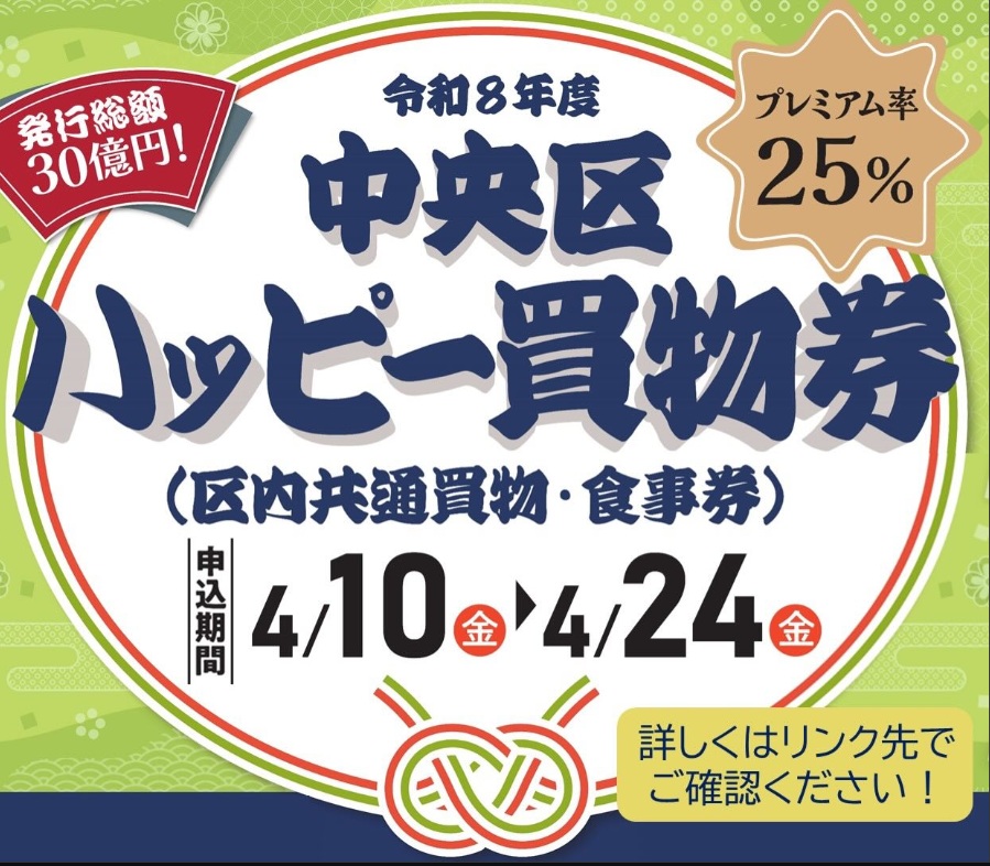 私が住んでいる東京都中央区で、先週から「ハッピー買物券」の申し込みが始まりました。中央区内のお店で使える買い物券が25%のプレミアム付きで購入できるというものです。対象となるのは16歳以上の区民・区内在勤者です。