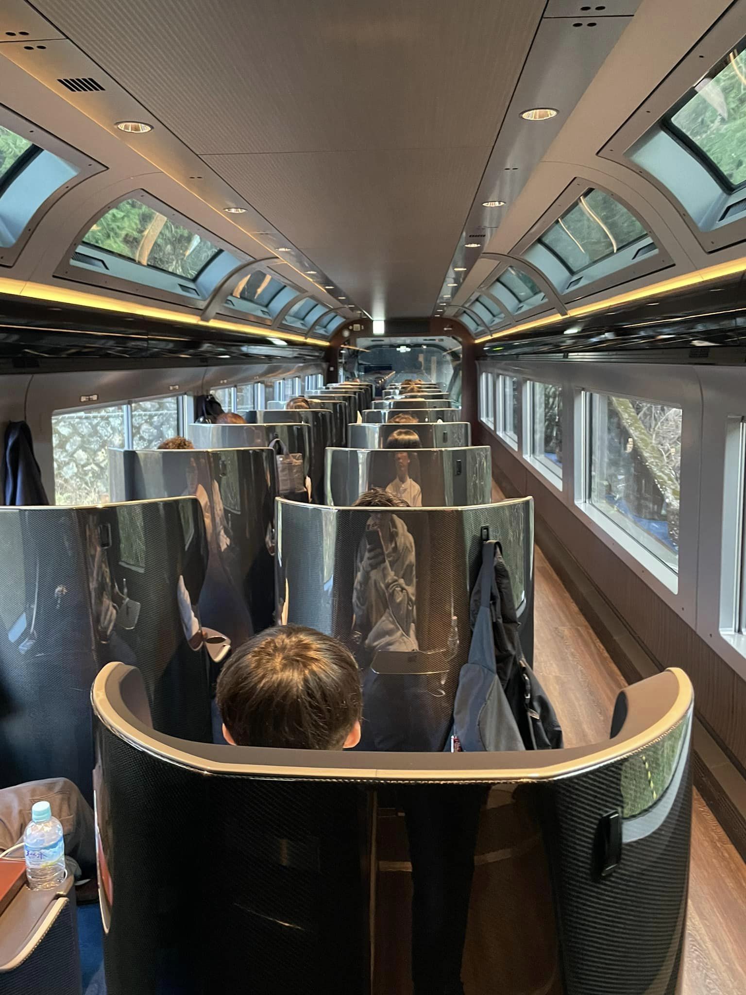 窓が大きく、天井にもガラスが使われて開放感があり、なかなか良い列車です。