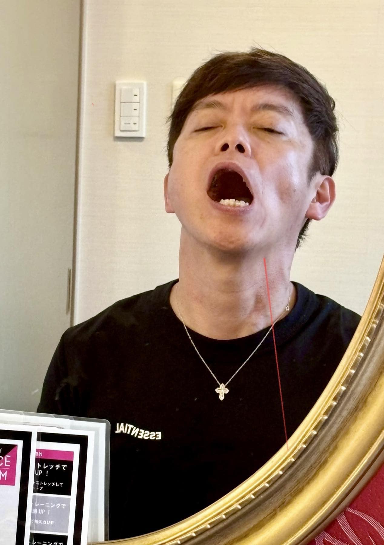 最近、顔筋トレーニングに加え、新たに喉の声帯部の筋肉を鍛えるトレーニングをやってもらいました(写真)。これは首まわりの見た目を改善することにつながります。