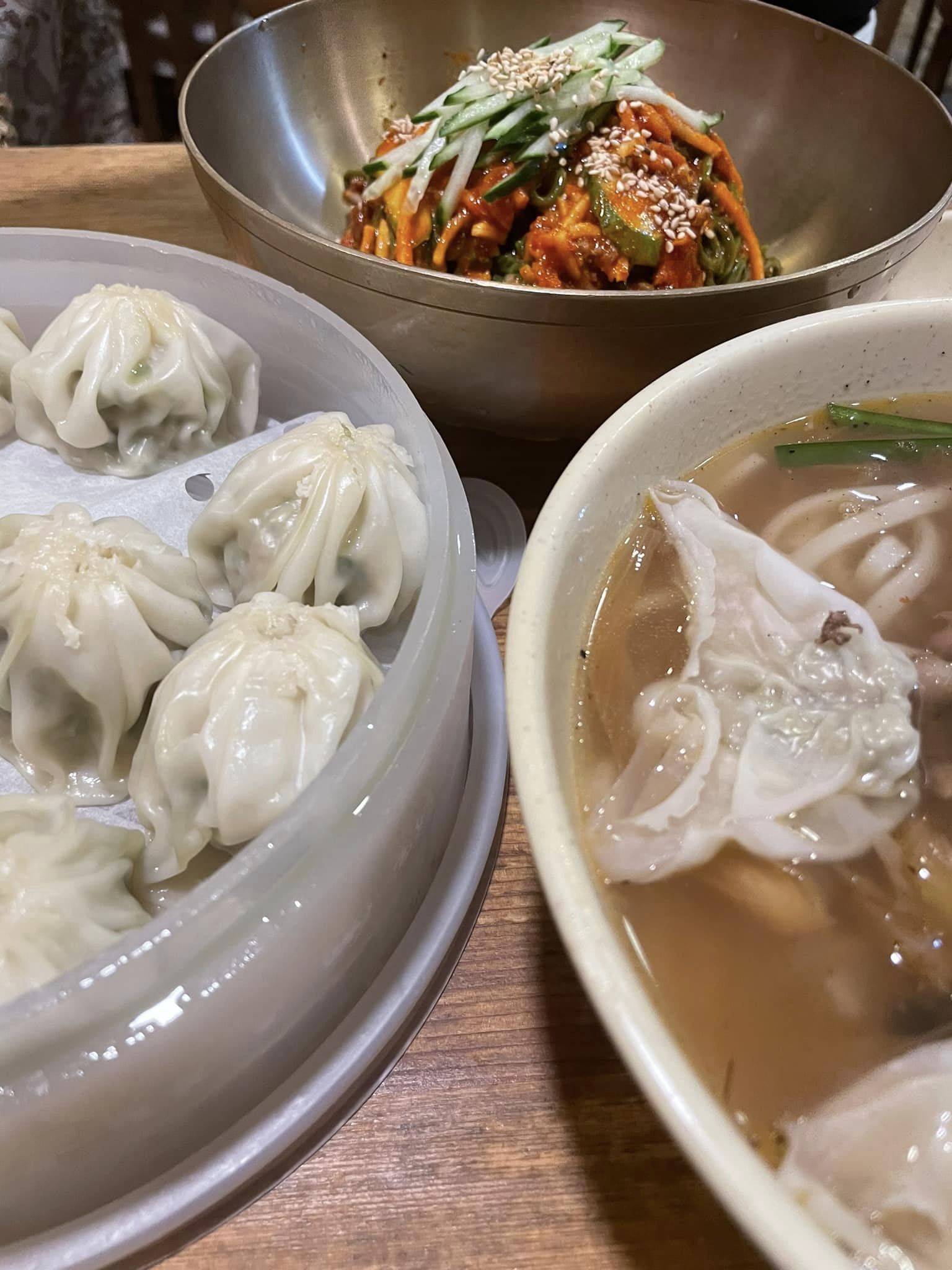 メニューは看板商品の鶏出汁うどんカルグクスにチンマンドゥと呼ばれる蒸し餃子、辛い冷麺のビビングクス(写真)、さらに季節限定のコングクスしかありません。