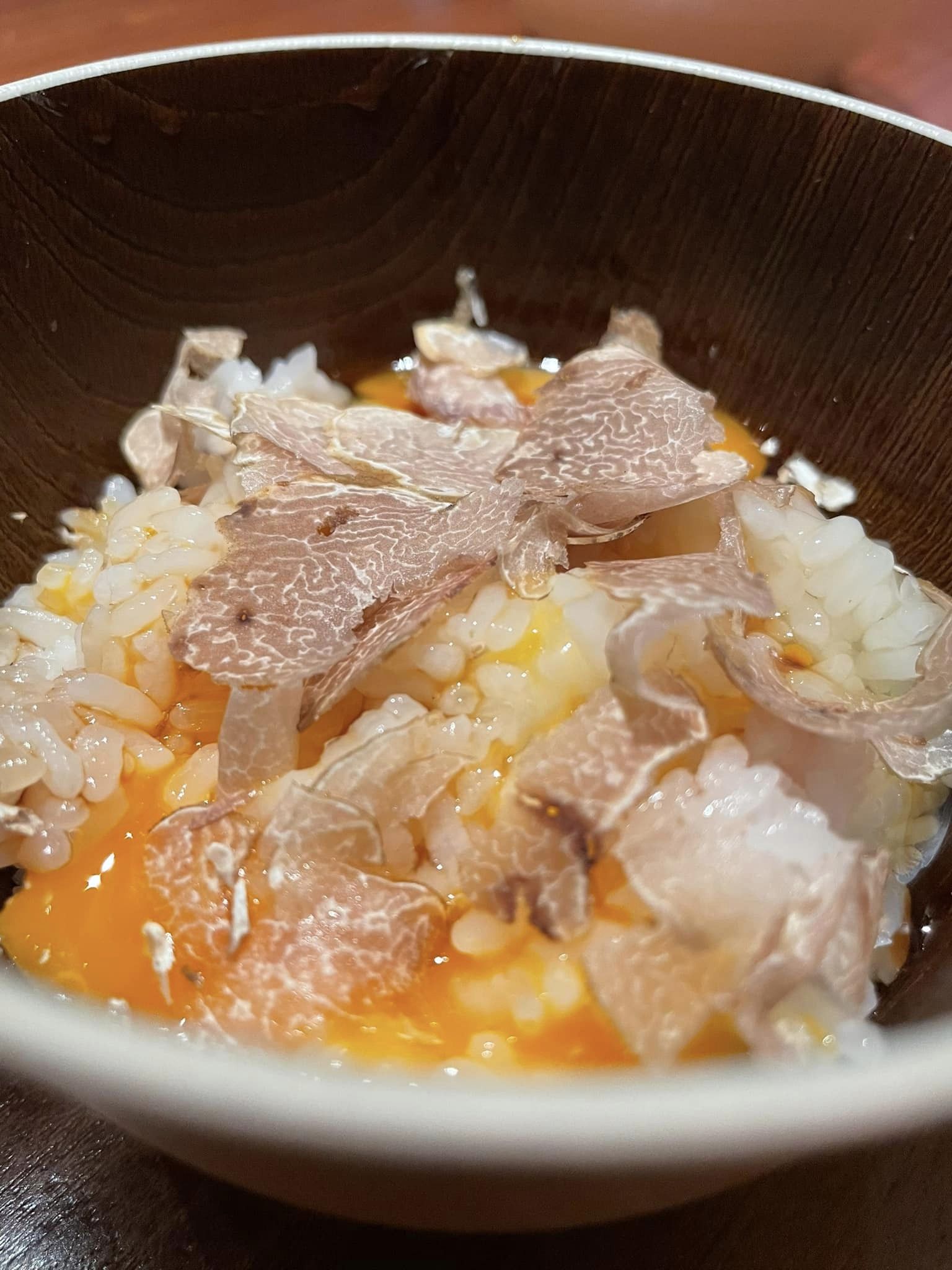 白トリュフは卵との相性がとても良く、特に特別な卵を使ったTKG(卵かけご飯)に白トリュフをスライスした「白トリュフTKG」は最高でした(写真)。