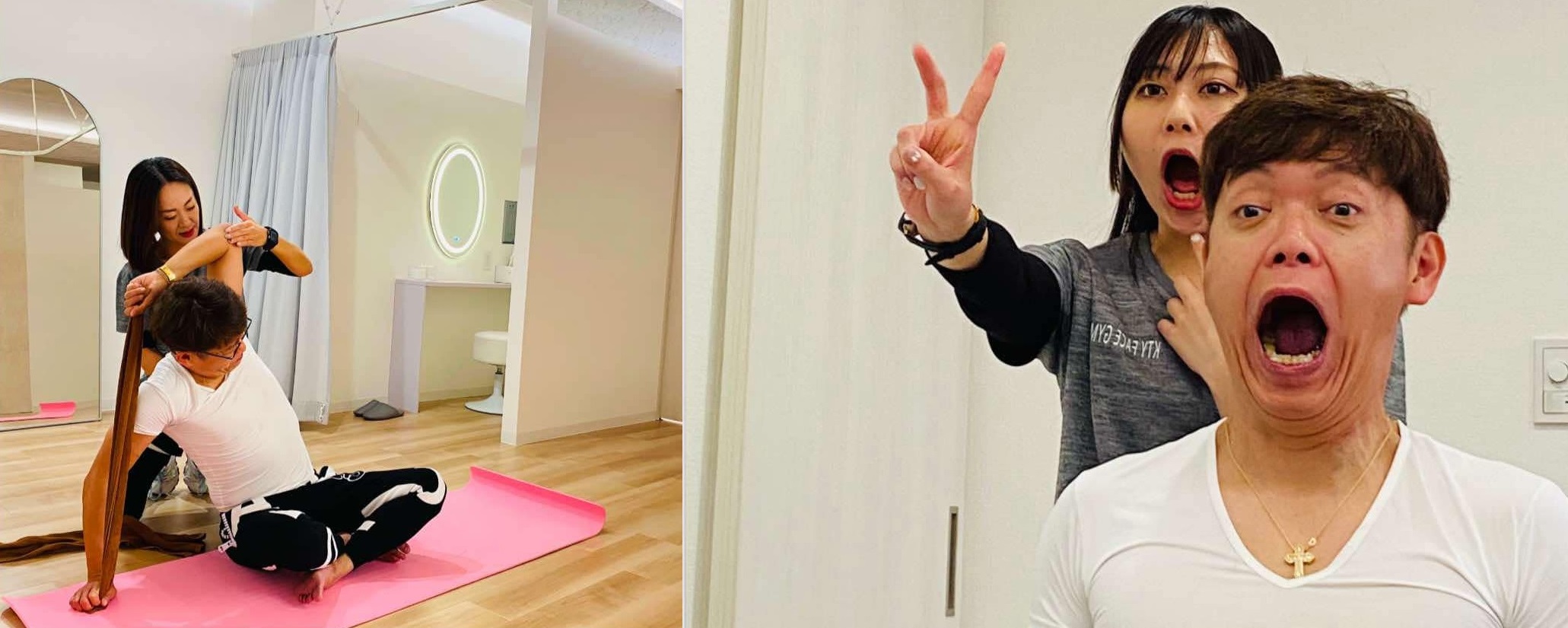 表参道のスタジオとの大きな違いは、ヨガができるようなストレッチスペースがあって、ストレッチをしてから顔筋トレーニングを行う流れになっていることです。