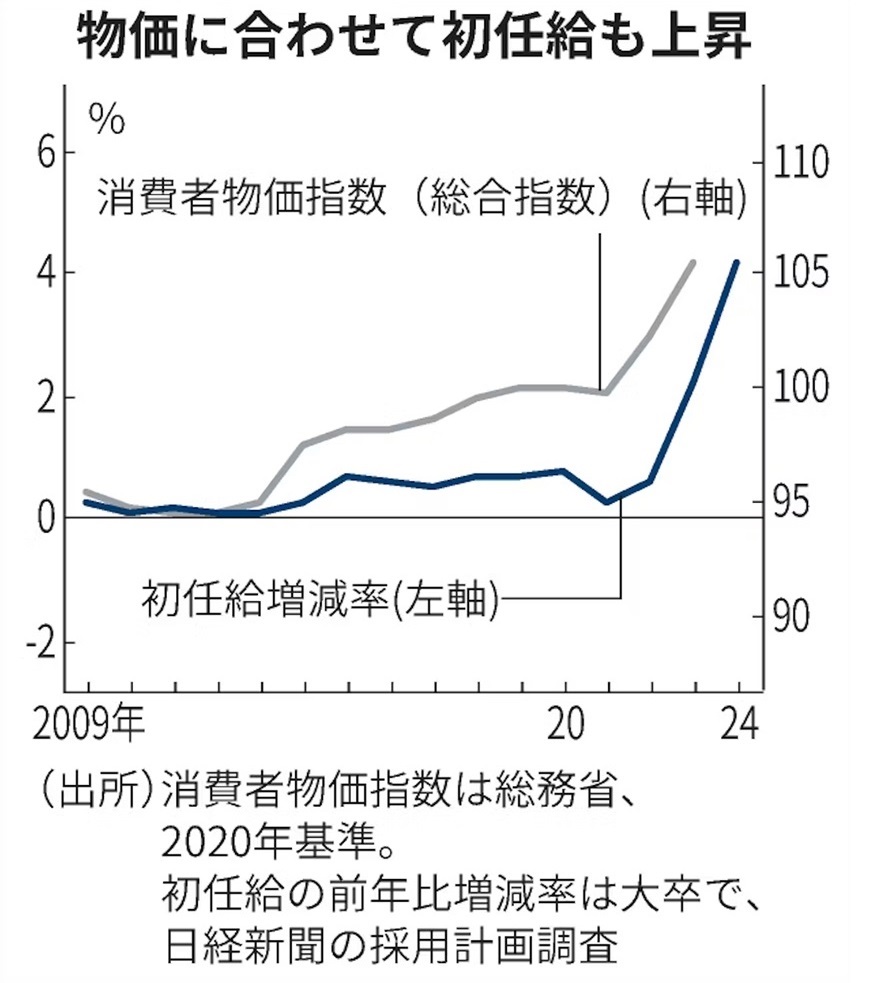 物価の上昇に対応し社員の生活水準を維持するという目的もあるようですが、新入社員の給与の伸びは全体よりも高い傾向があり、企業が人材確保のために待遇改善に乗り出したと考えるのが自然です。