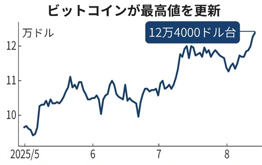 日経新聞電子版によれば暗号資産(仮想通貨)の代表であるビットコインも直近で12万4000ドル台まで上昇し、約1カ月ぶりに最高値を更新しています(図表も同紙から)。ビットコイン以外の暗号資産にも資金が流れ込み価格上昇しています。