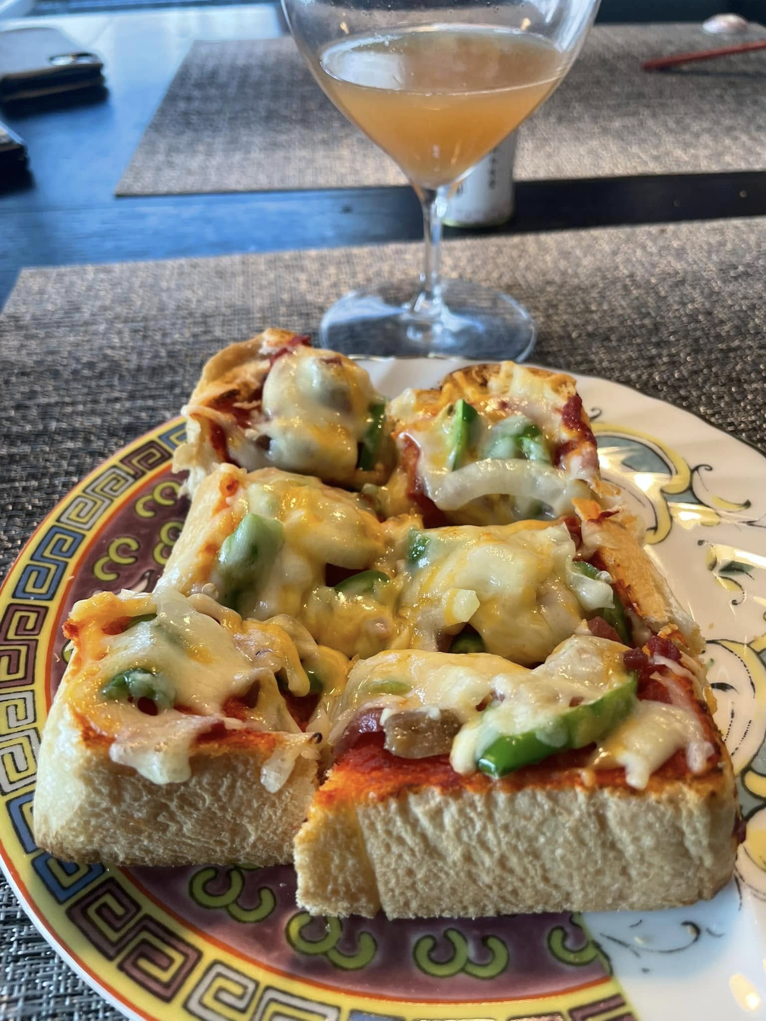 厚切りのパン(スーパーで売っているチープなもの)にトマトピューレを塗って、ピーマン、ハム(これも安物が美味しい)、玉ねぎのスライスに「かけちー」をたっぷりかけてオーブンで焼きました。自分が好きな味に仕上げるので、シンプルに美味しいです。