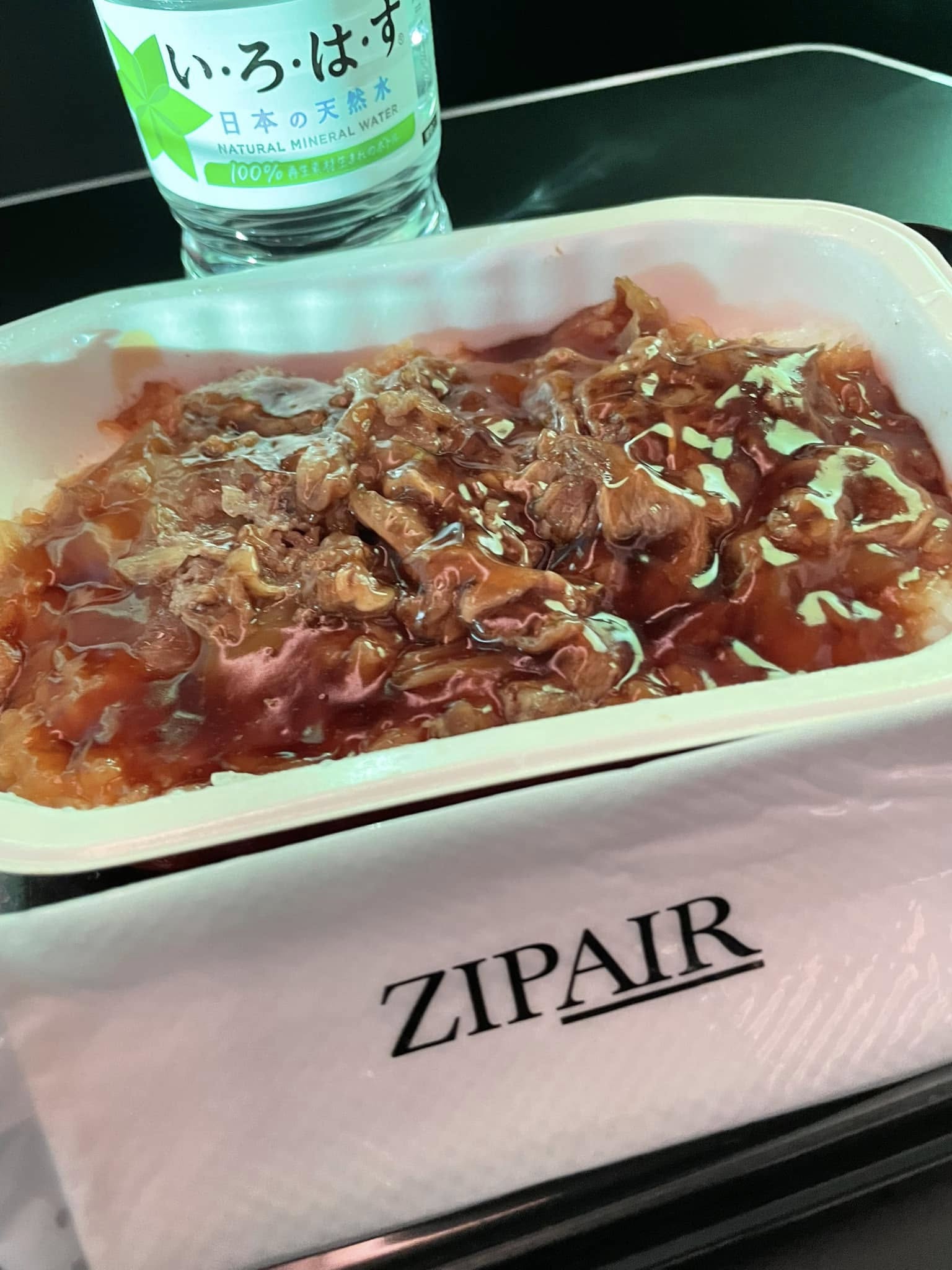 機内で注文できないと困ると思い、ミネラルウォーターを持ち込み、搭乗前に牛丼を予約しておきました。