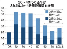 日本経済新聞社が読者約1900人を対象にしたアンケート調査では約3割の回答者が3年前に比べ新規投資額を2倍以上にしたという結果が出ています(図表も同紙から)。これは昨年から導入された新しいNISAをきっかけに現預金を取り崩して投資する人が増えてきたことを示しています。