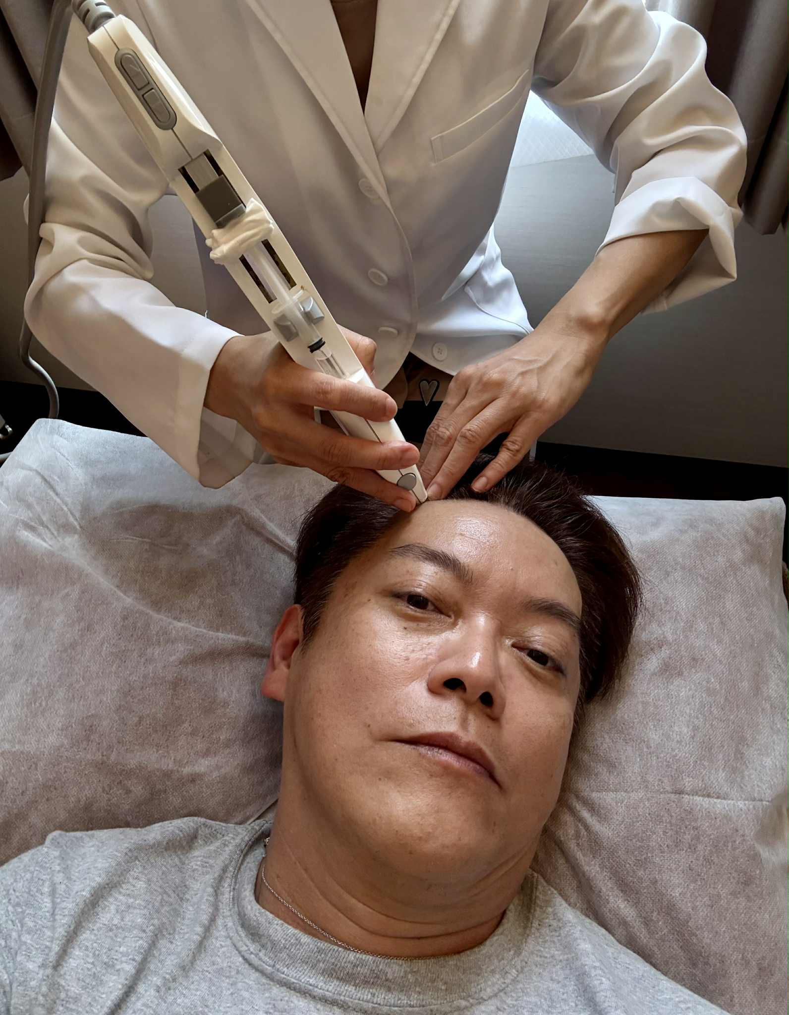 私の場合、おでこの左側の頭皮にコリがあって、これが毛根にマイナスの影響を与えています。そこで、頭皮マッサージとキャピシル(Capixyl)の導入をやってもらいました。