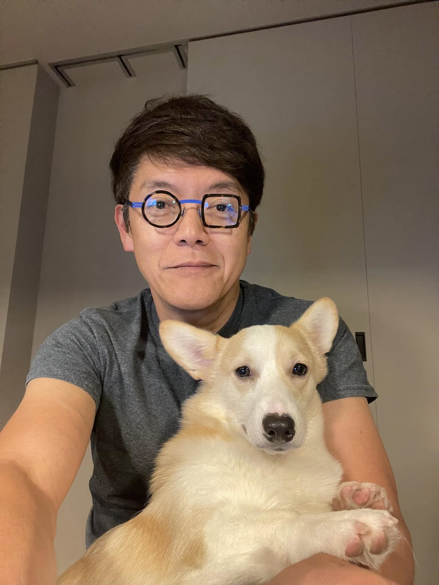 自宅にいるといつも同じ部屋にいます。リビングルームで仕事をしているとすり寄ってくるので抱っこしてパソコンに向かったり(写真)と、犬に振り回されるドッグライフを楽しんでいます。