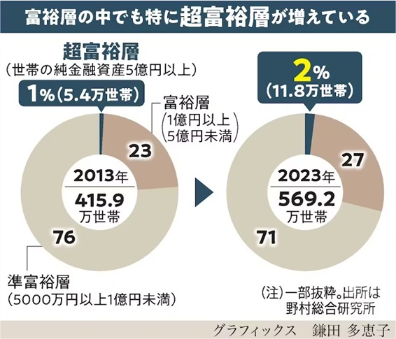 日本経済新聞電子版によれば、純金融資産が5億円以上の「超富裕層」と、1億円以上5億円未満の「富裕層」は2023年に約165万世帯となり、2021年から11%増加したそうです(図表も同紙から)。