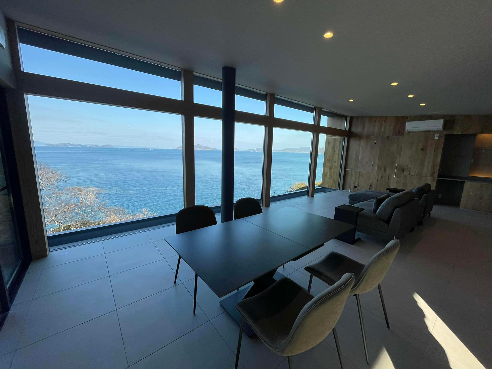 今回の物件の最大のウリは高台から遮るものが無く瀬戸内海が一望できるパノラミックな眺望です。写真は物件のリビングルームから瀬戸内海を見渡したものですが、さらに追加の家具が搬入されます。ソファに座って海を見ながらのんびりワインやビールを飲めるようになります。