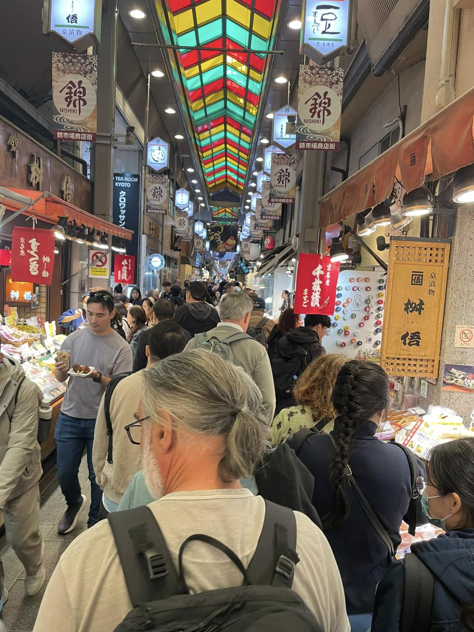 京都の街でよく来るのが錦市場です。こちらは400年以上続く京都の老舗商店街で、野菜やお魚、漬物などの日常品を売っているお店がたくさん並んでおり「京の台所」と呼ばれ親しまれてきました。